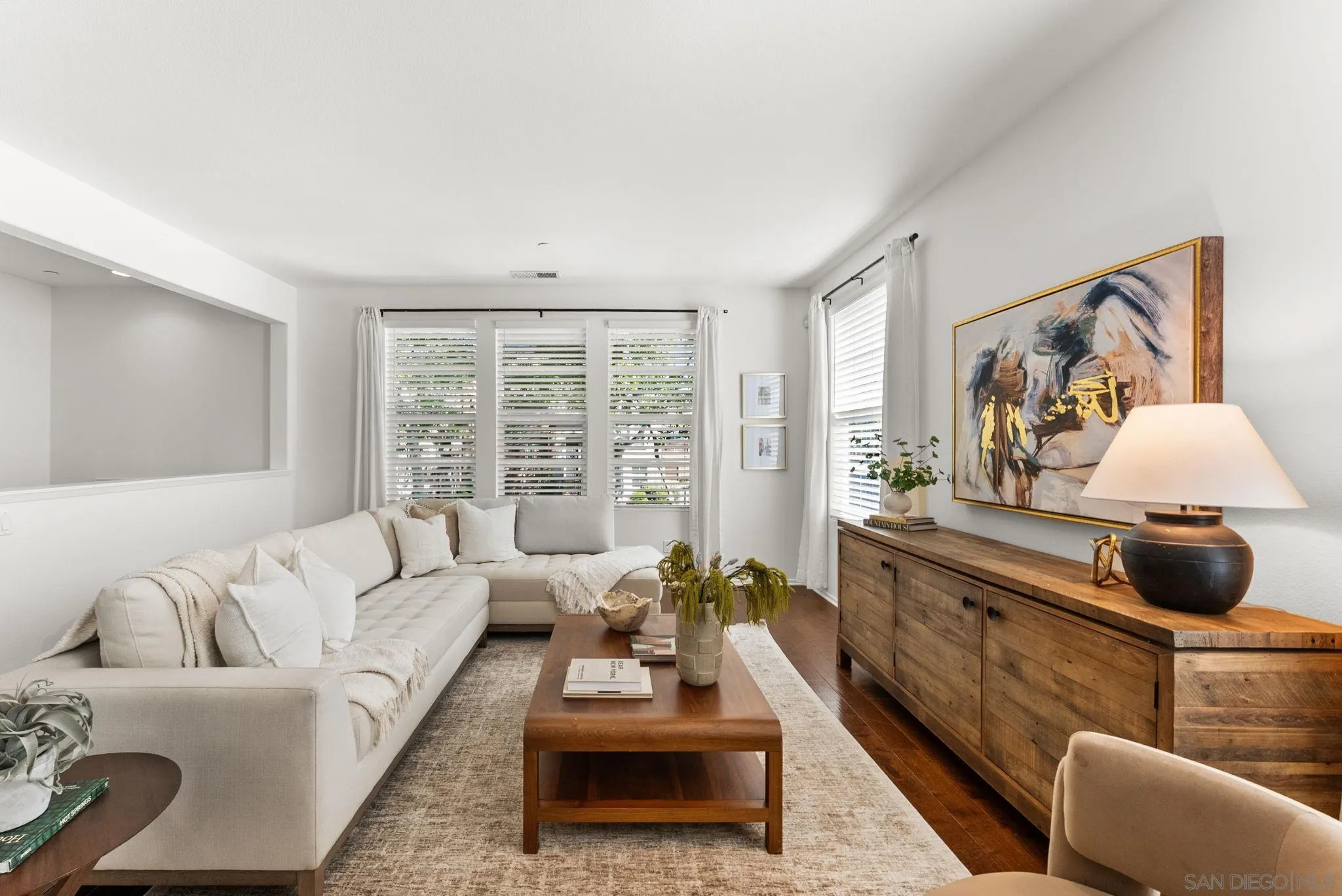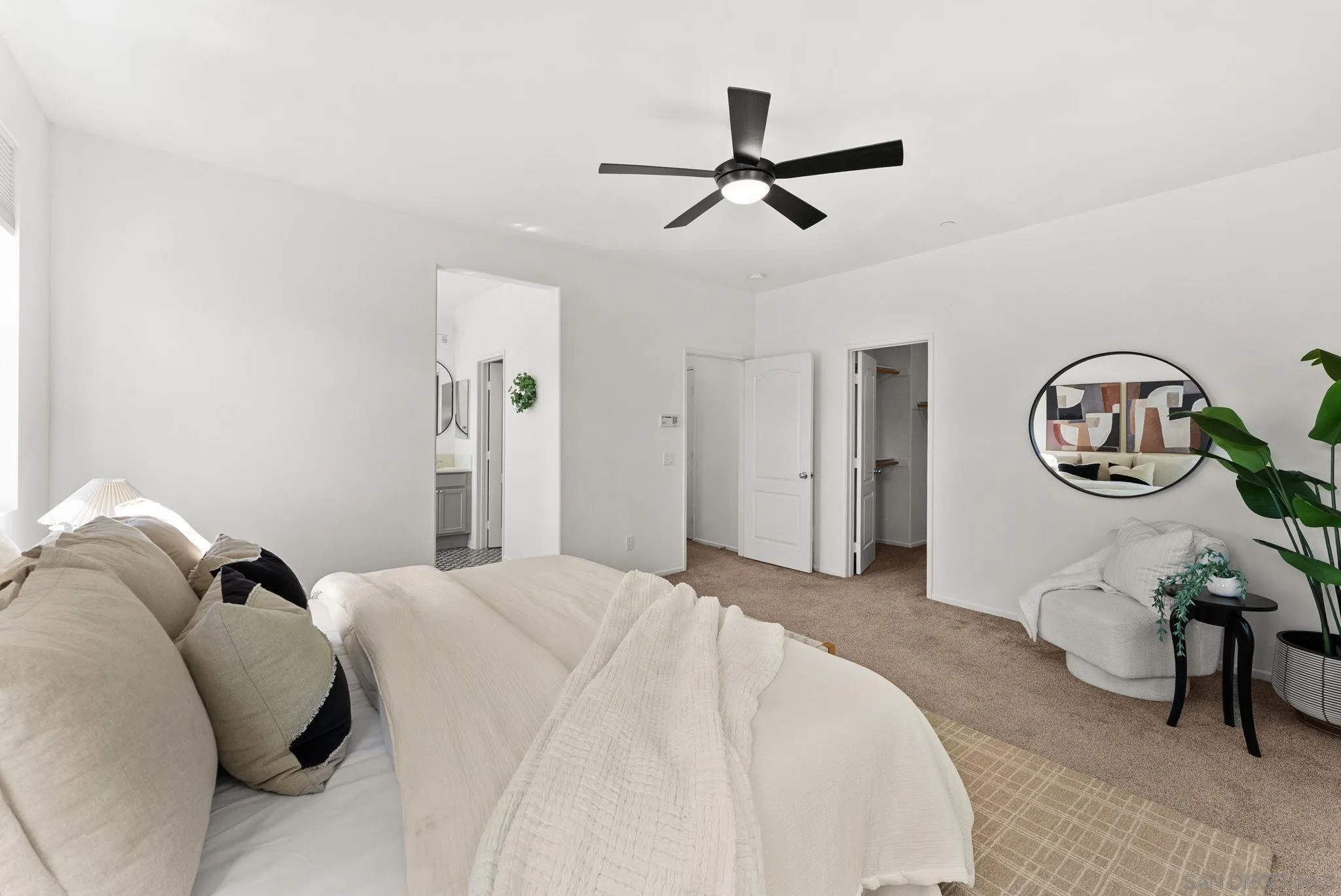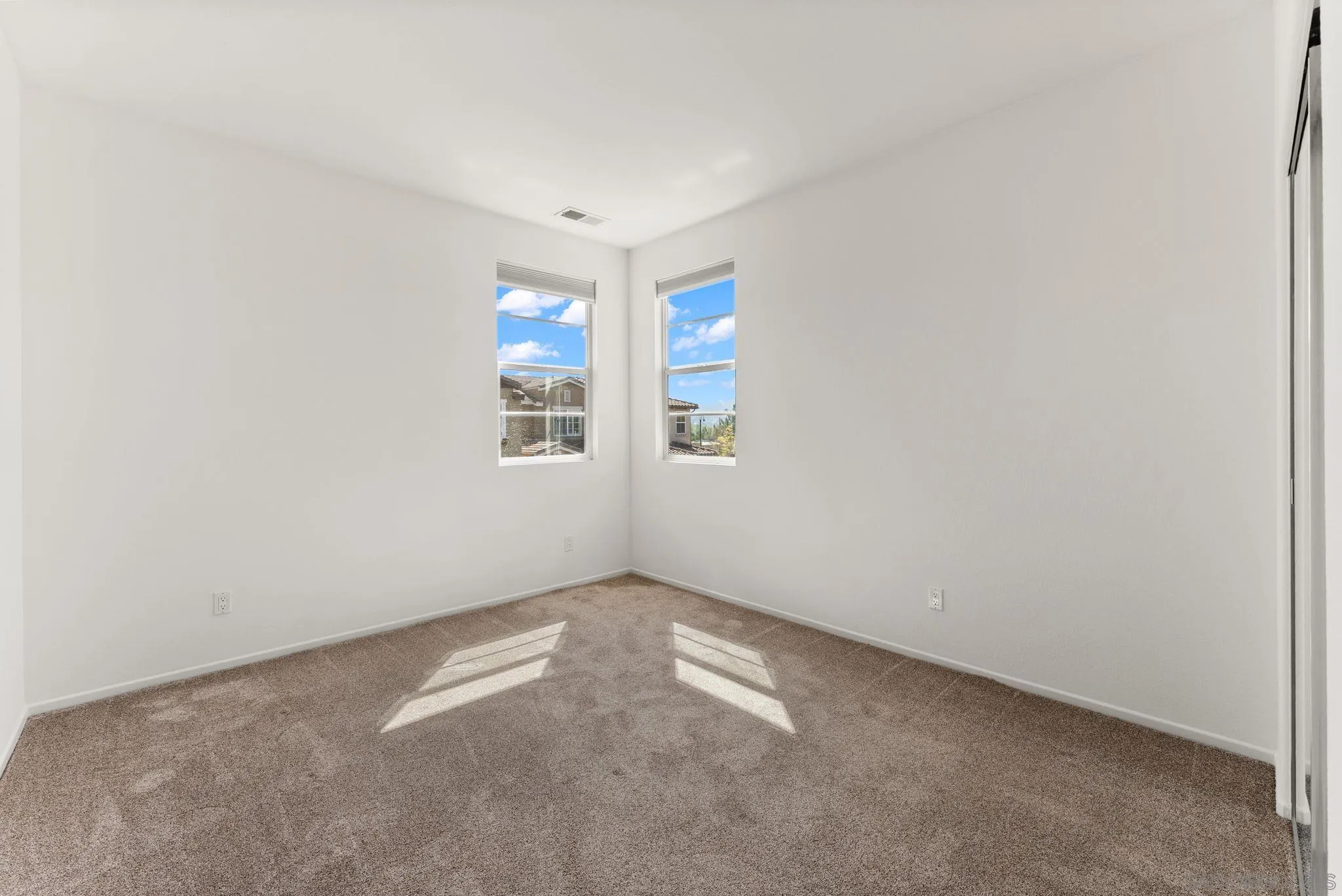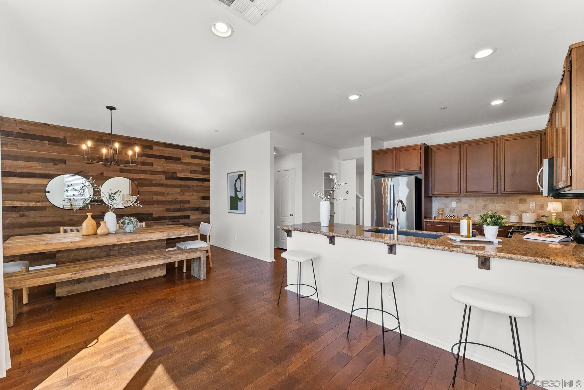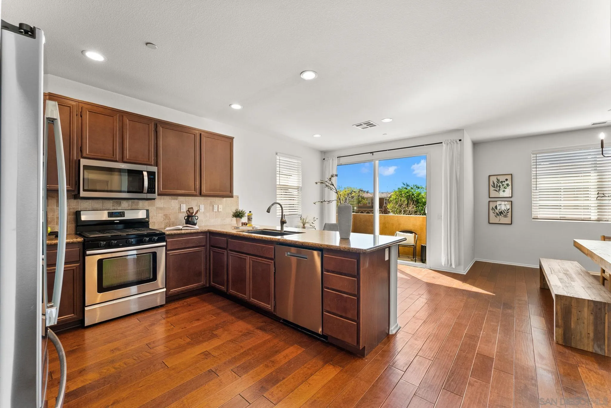 Located in the highly sought-after Riverwalk community, this spacious end-unit, detached rowhome offers one of the largest floor plans available, with over 2,220 sq ft, 4 bedrooms, and 3.5 bathrooms perched above an expansive greenbelt. The home lives and feels like a single family home with direct garage access and laundry room. Inside, the main living area is filled with natural light and showcases high ceilings, fresh interior paint, and hard surface flooring. The large kitchen offers ample cabinetry, a walk-in pantry, and opens to a large dining area that's perfect for everyday living or entertaining. The flexible layout works for a variety of living situations, with a downstairs bedroom, full bath, and a generously sized bonus room ideal for a secondary living space, guest suite, or home office. Upstairs features dual primary suites, offering both comfort and privacy. Additional highlights include updated windows, new AC, updated kitchen appliances, a full laundry room, and direct access to the attached two-car garage. Riverwalk residents enjoy access to a community pool, spa, tot lot, and multiple greenbelts, making this a well-rounded place to call home. Just across the street from the highly rated K-8 school, YMCA, and the Santee Sportsplex, home to summer concerts, 4th of July celebrations, and year-round events. The location offers an unbeatable blend of convenience and community. Come see why people love living here and choose to stay!