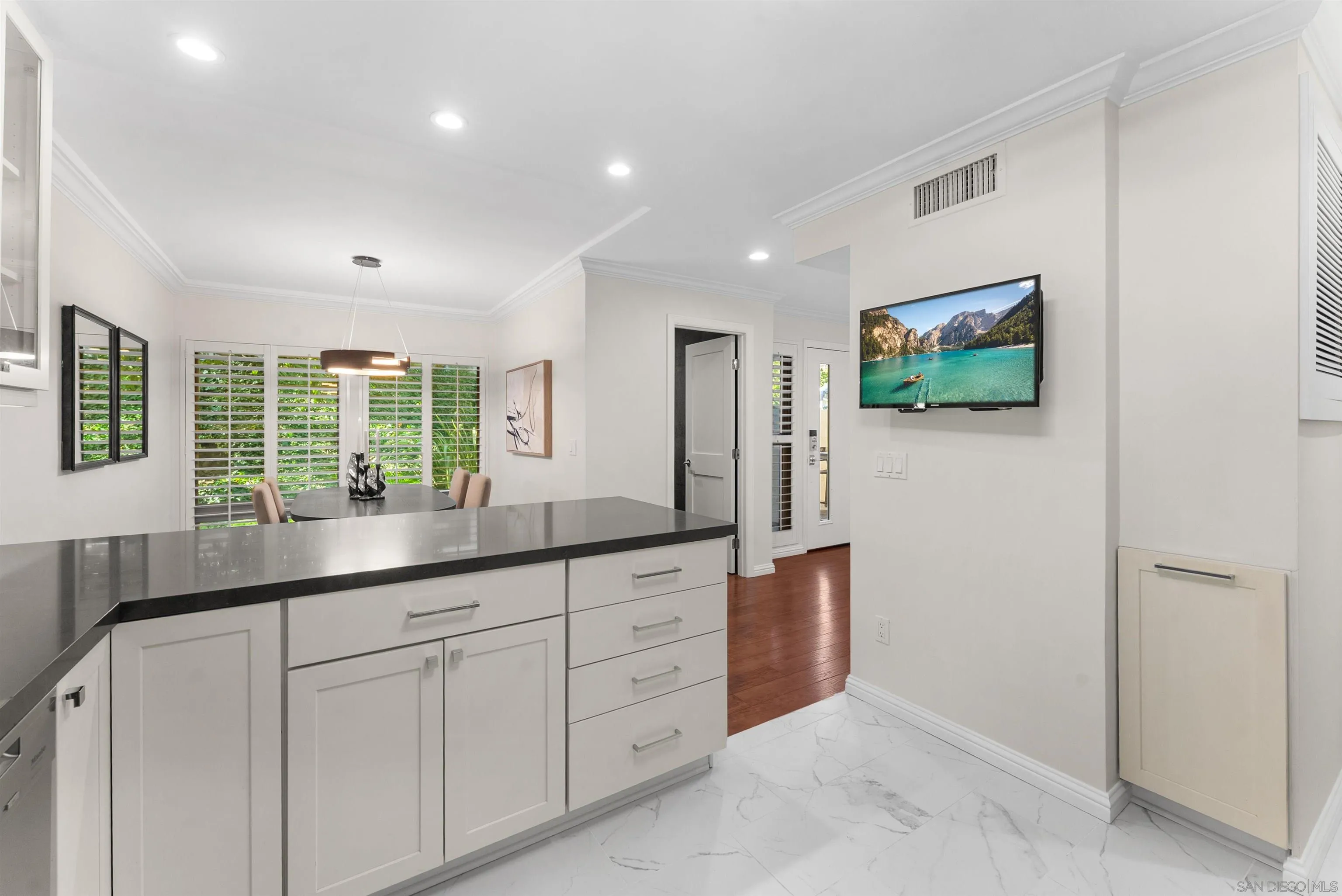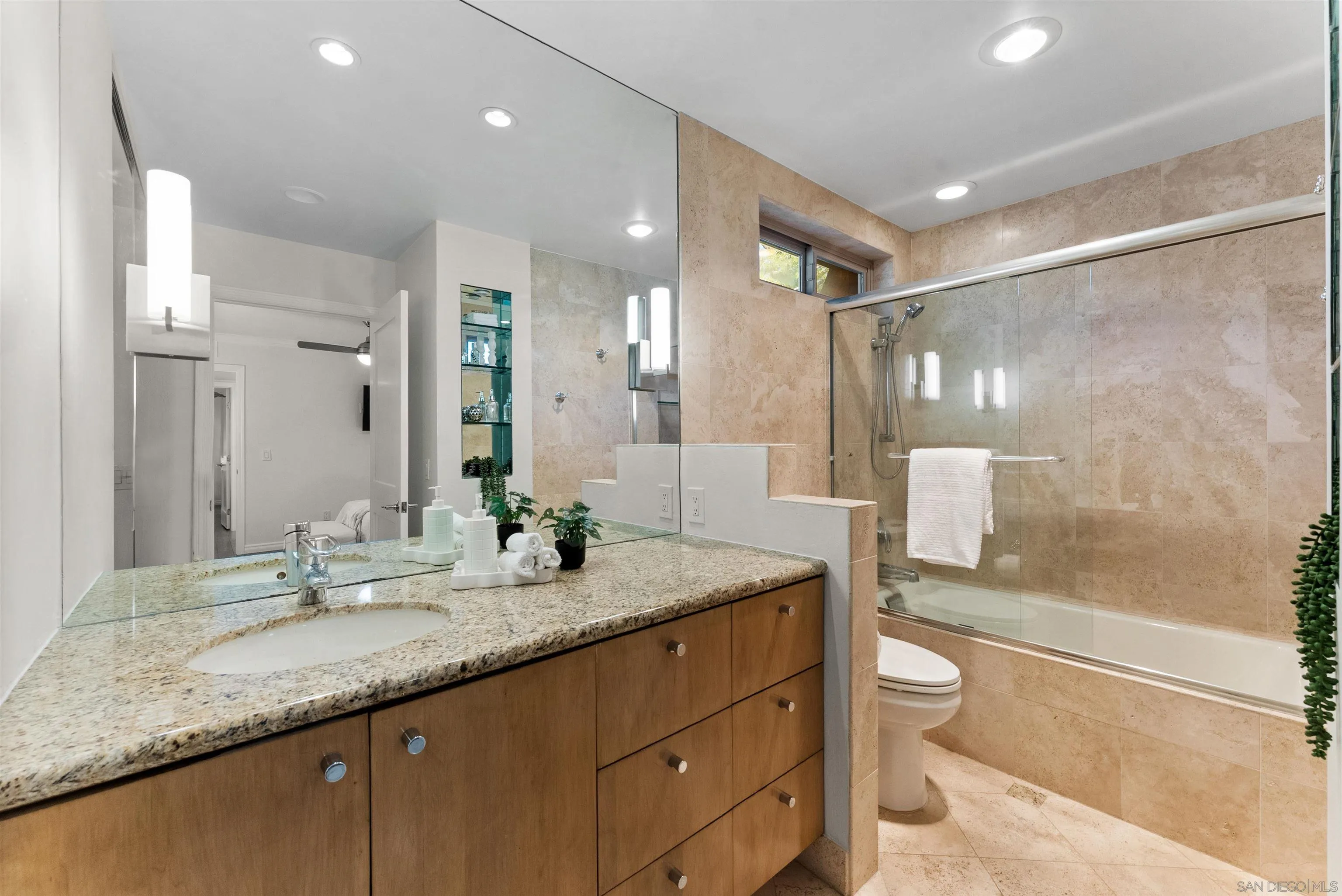 Truly one of San Diego's best-kept secrets. Tucked within a gated, 38-acre hillside community in the foothills of Kensington, Kensington Park Villas offers a private, park-like setting that feels worlds away, yet remains centrally located. This fully turnkey residence has been thoughtfully updated throughout, featuring hard-surface flooring, fresh interior paint, and upgraded windows and doors. The living room is centered around a tiled fireplace, creating an inviting space for relaxing or entertaining. French doors open to a private patio surrounded by lush greenery, ideal for morning coffee or evening unwinding. The remodeled kitchen showcases modern cabinetry, tile flooring, and stone countertops, seamlessly flowing into the dining room. Dual primary suites offer multi-function living, separated by conveniently located laundry area with storage. Both primary suites feature updated bathrooms with custom tiled showers. Additional highlights include custom shutters throughout, central AC, ample storage, tankless water heater, detached one-car garage, and a private balcony. Set among mature trees, the community features 2 pools, 2 spas, a clubhouse, and just 145 residences with both gated vehicle access and pedestrian entry directly into Kensington. Enjoy close proximity to neighborhood shops, dining, and convenient access to I-8, I-15, I-805, and Mission Valley.